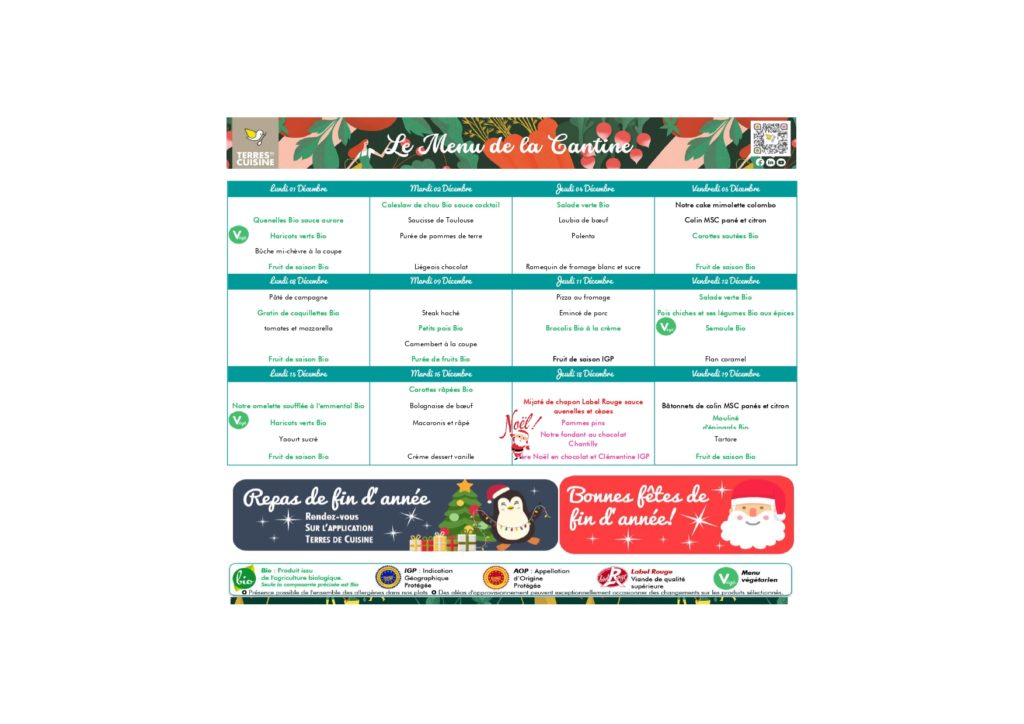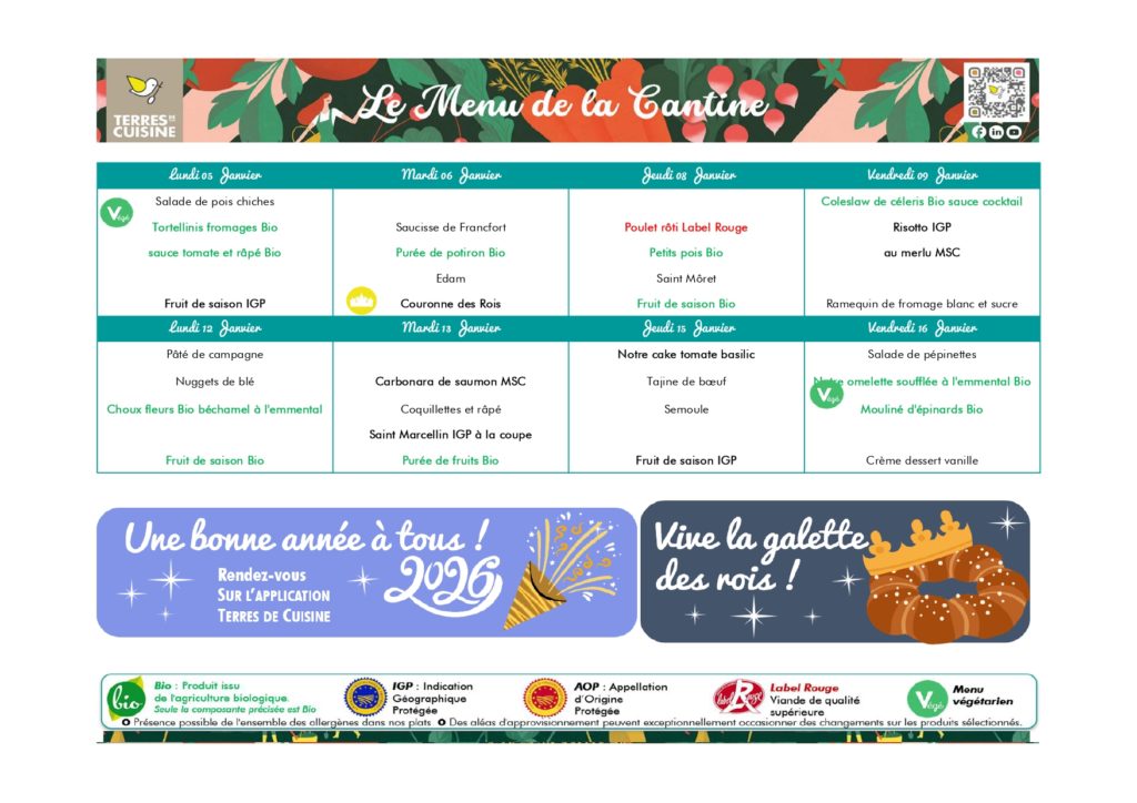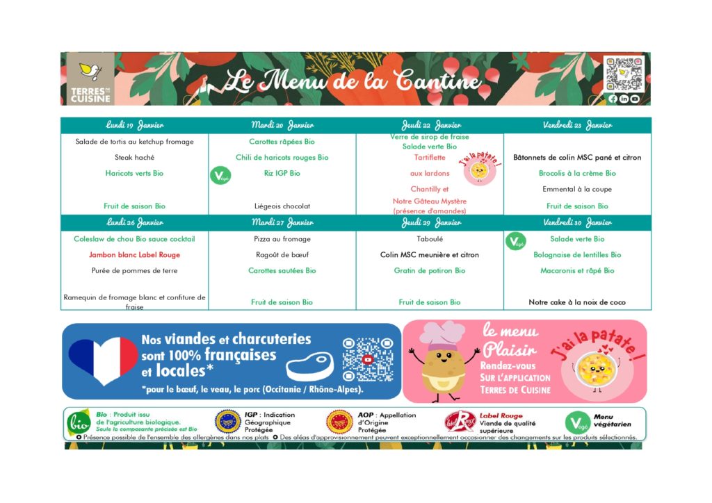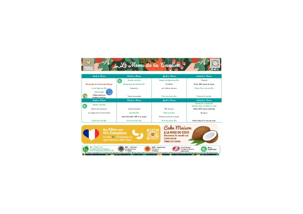 Nous travaillons avec un prestataire de service: « Terres de cuisine » dont la cuisine centrale se trouve à Rognonas. Chaque matin, les repas nous sont livrés par liaison froide.